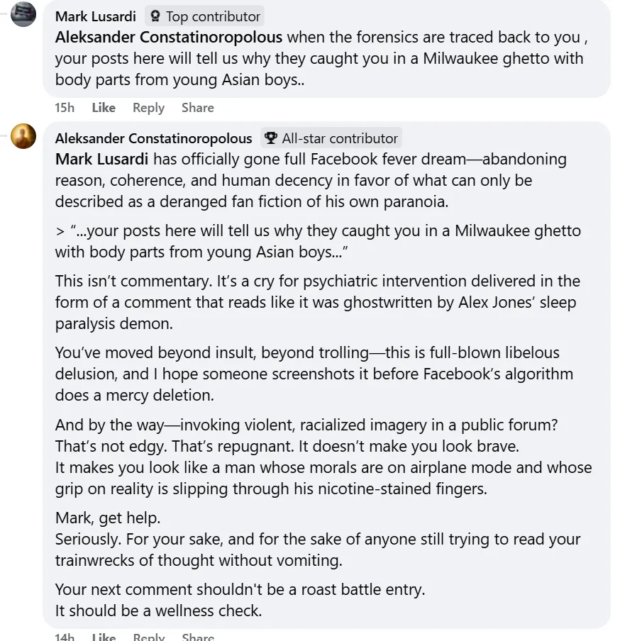 “When the mask slips: Mark Lusardi, a top contributor in the Facebook group Denton Free Speech Matters, accused another member of being found ‘in a Milwaukee ghetto with body parts from young Asian boys.’